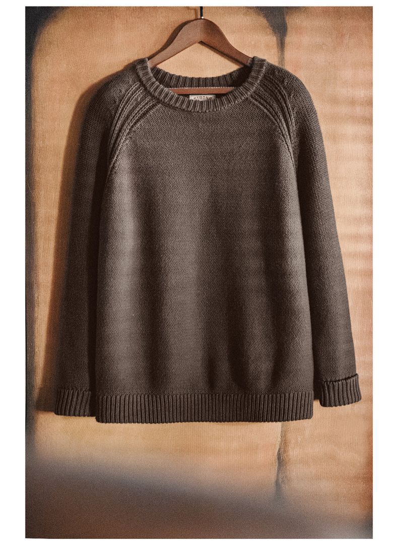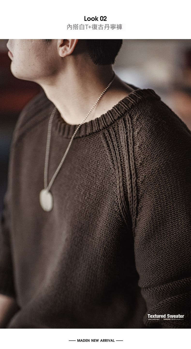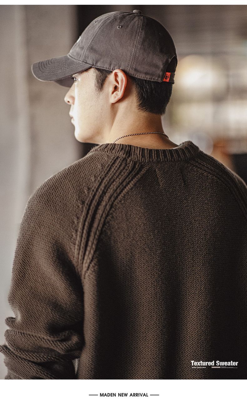 American retro heavyweight knit crew neck sweater with textured raglan sleeves, men's autumn and winter base knitwear