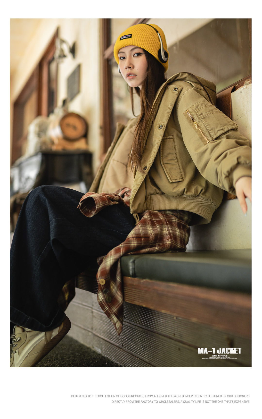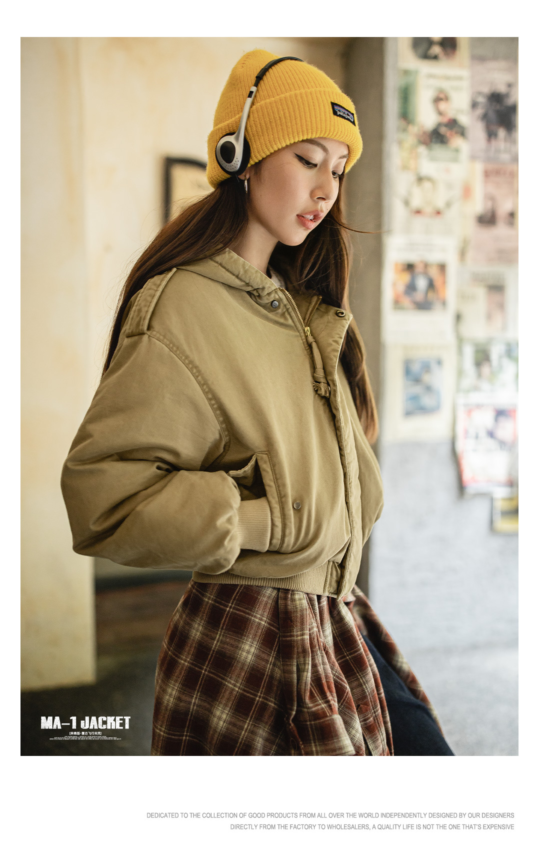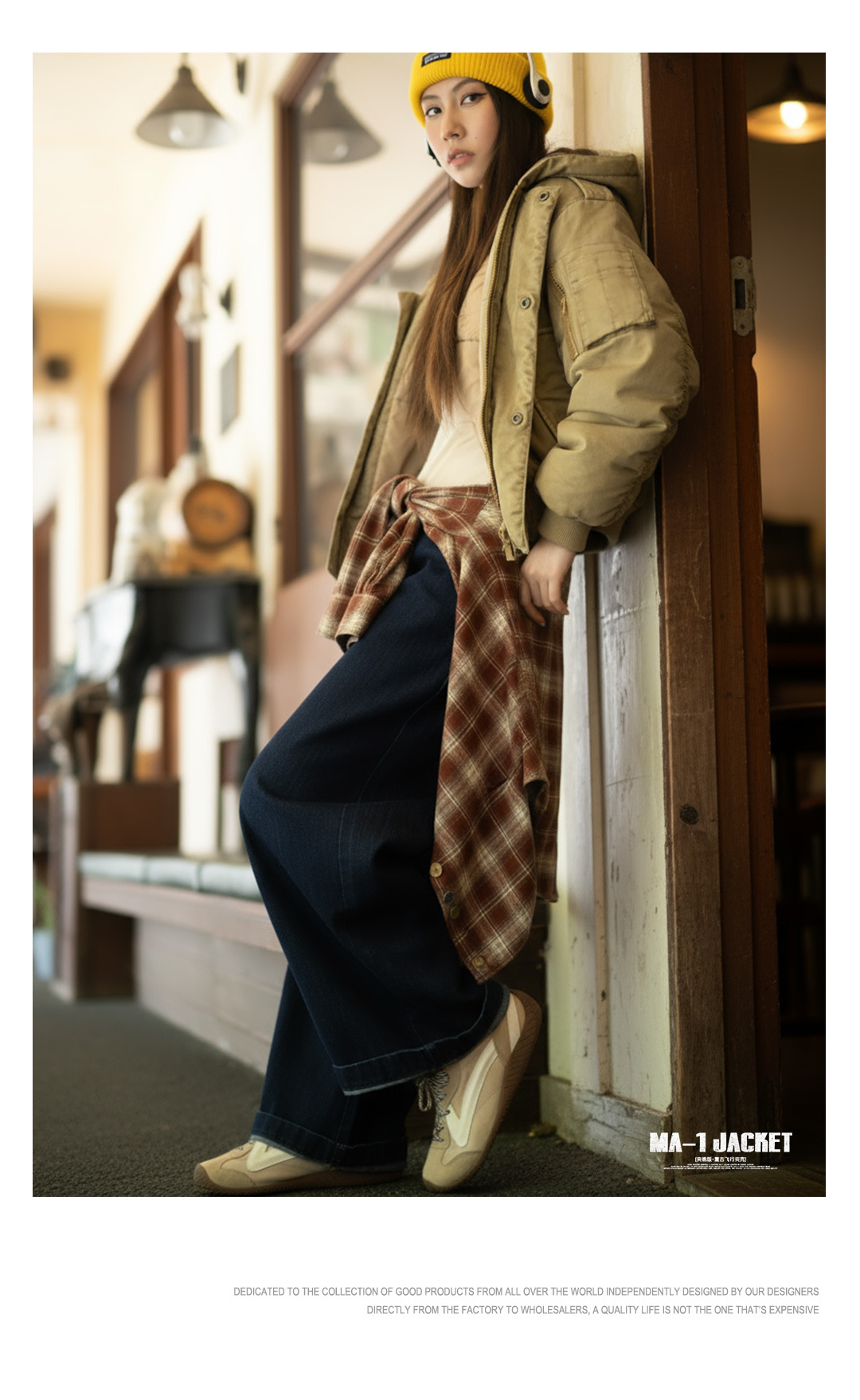 卡其色美式復古寬鬆飛行員夾克連帽工裝夾棉衣服外套女士秋冬