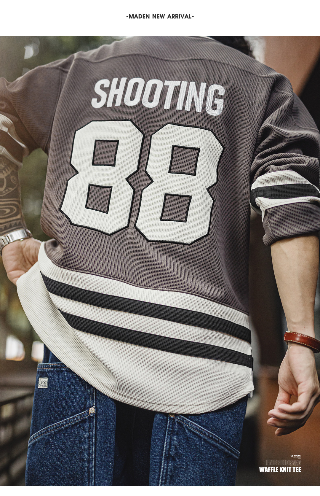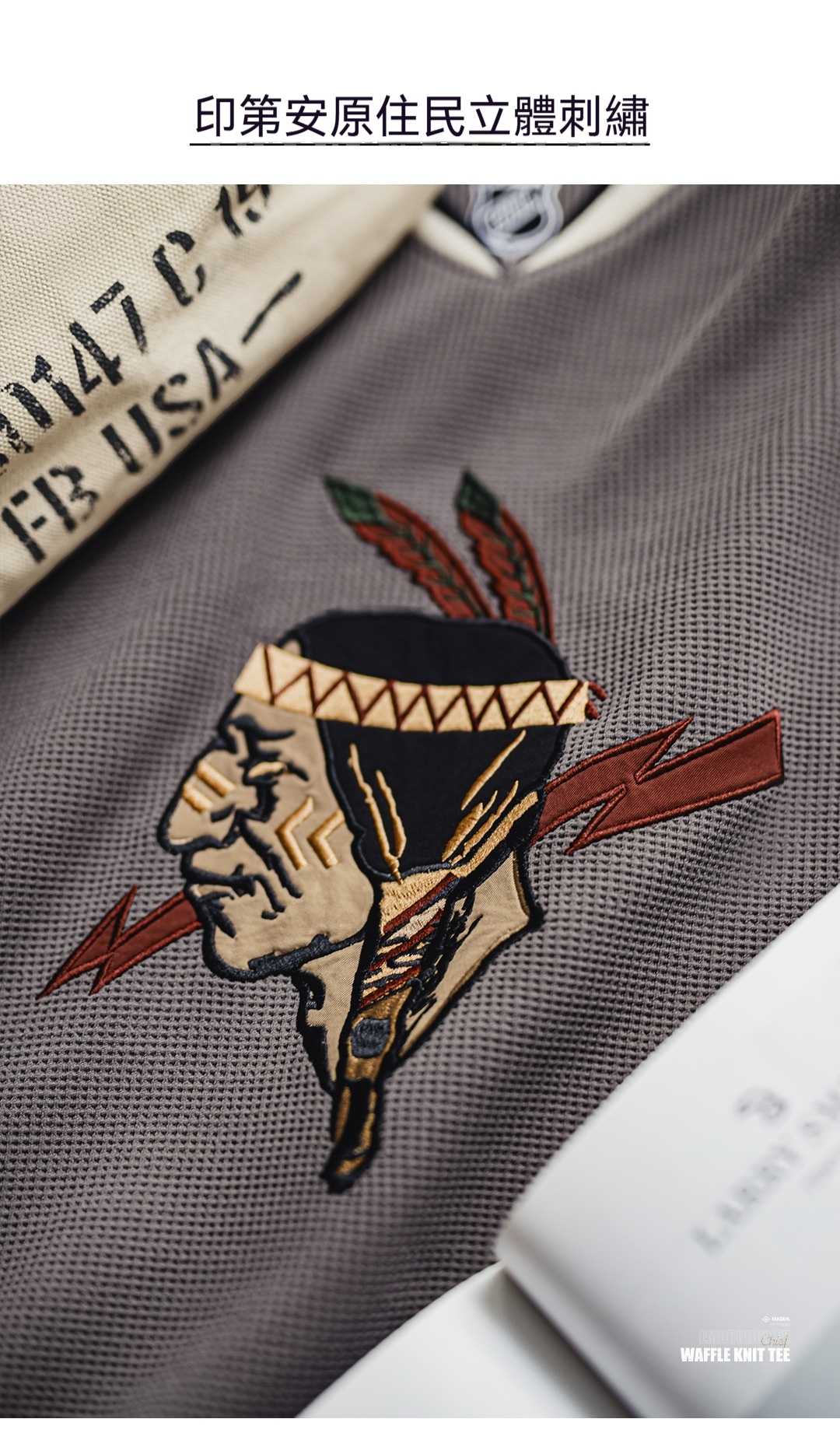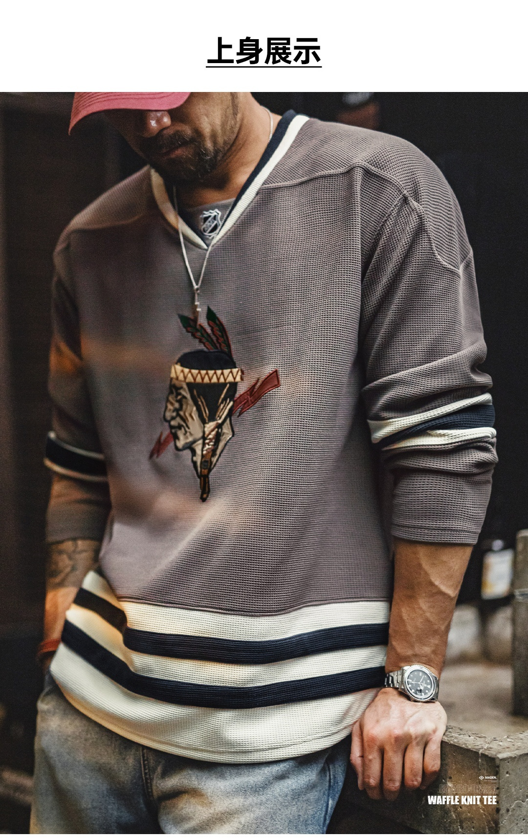 美式復古印第安v領華夫格長袖刺繡針織重磅衛衣外套男秋