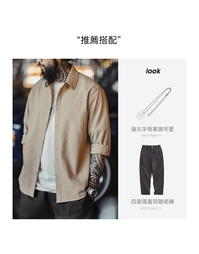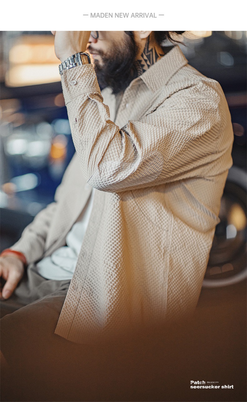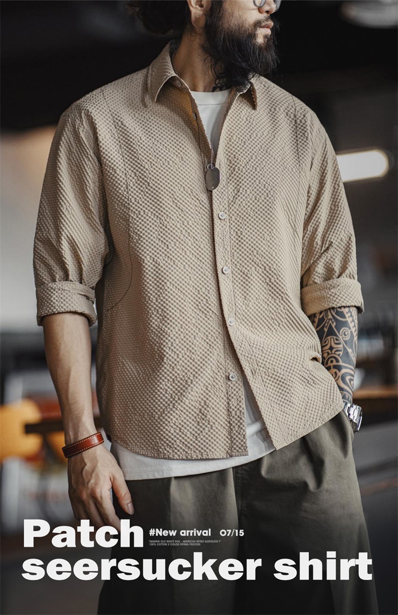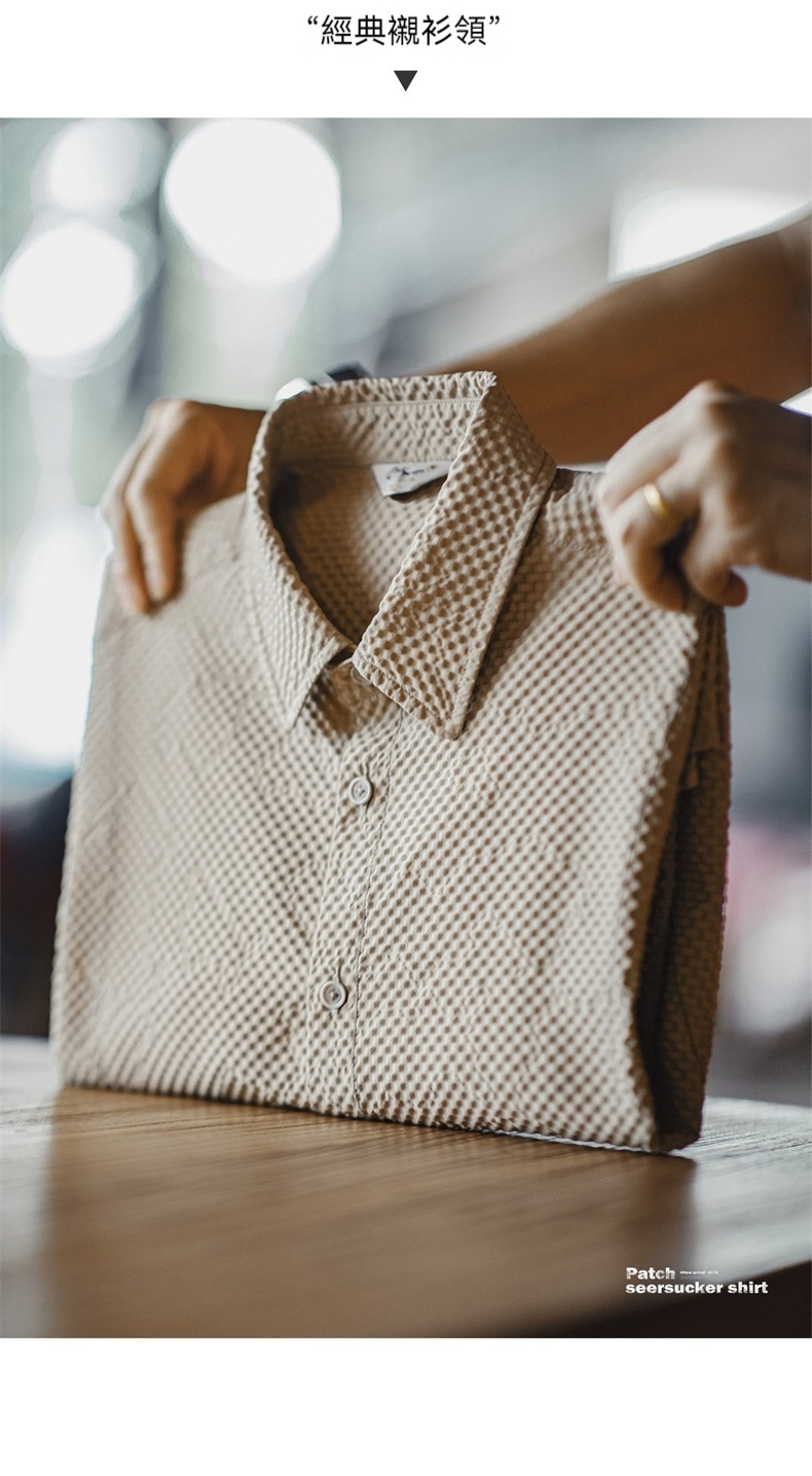 美式休閒泡泡紗免燙長袖襯衫肌理感薄款翻領襯衣外套男秋