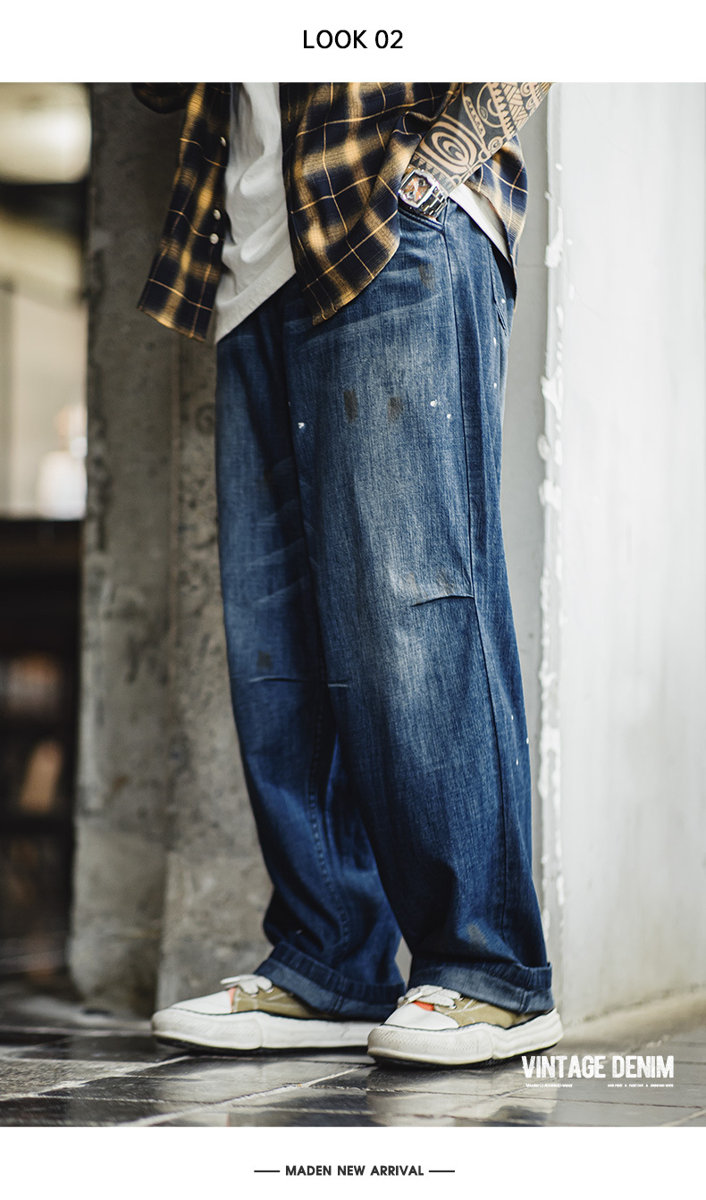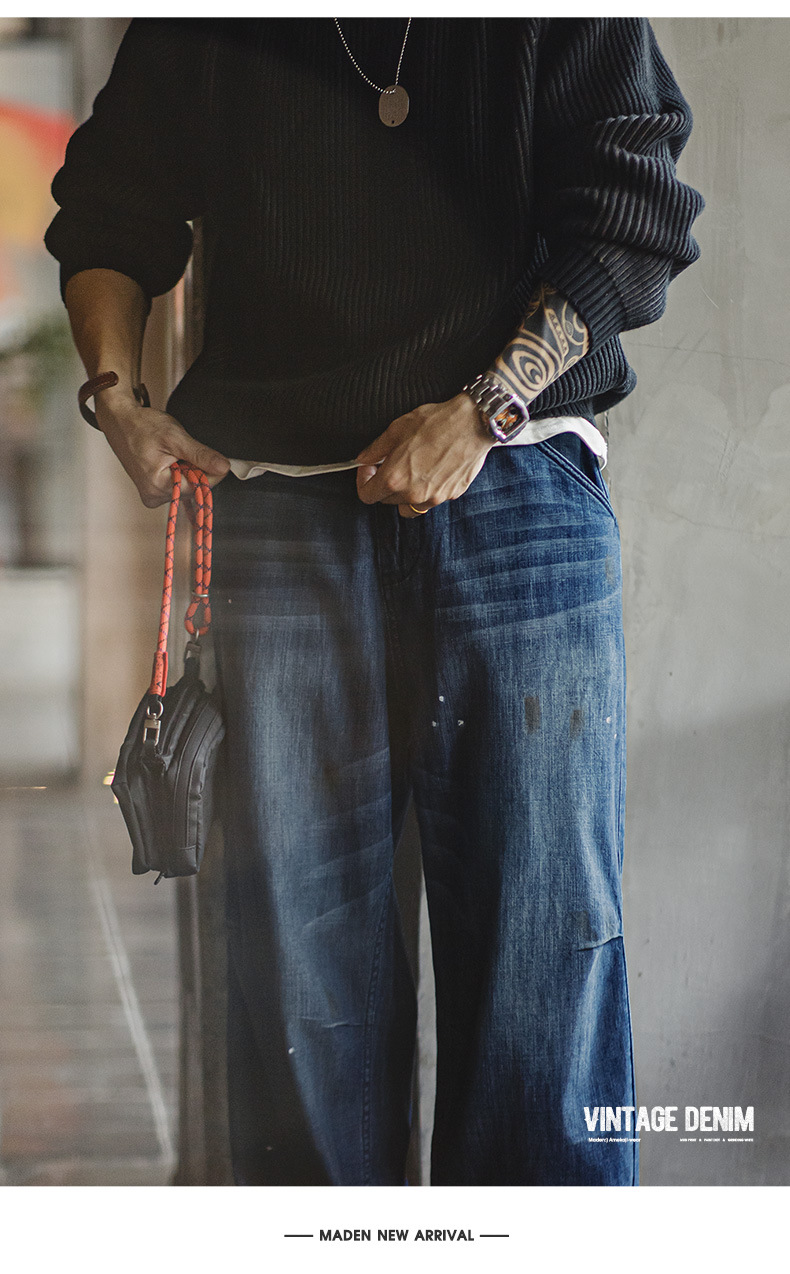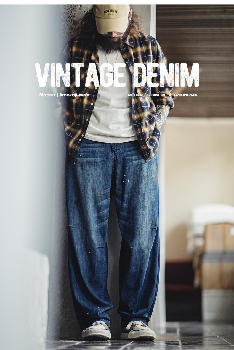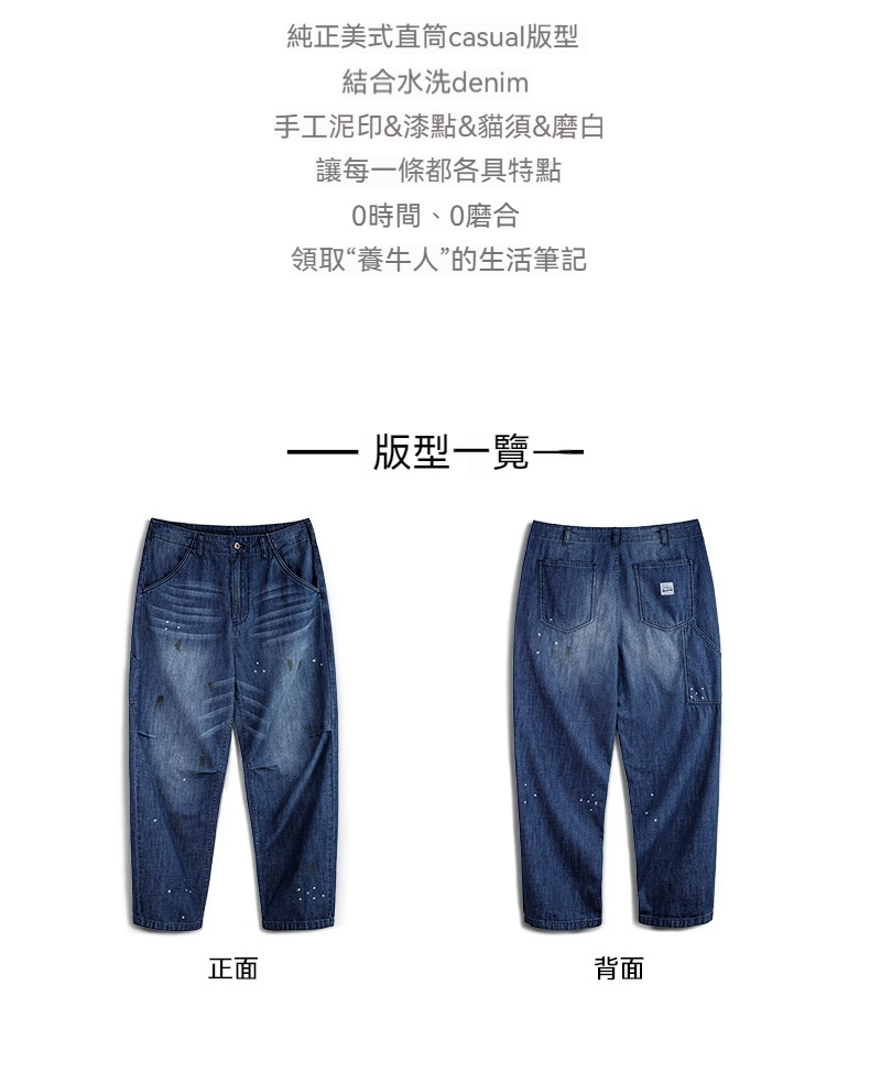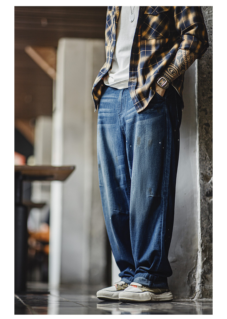 美式復古做舊磨白猫須牛仔褲寬鬆水洗丹寧潑墨直筒褲男秋