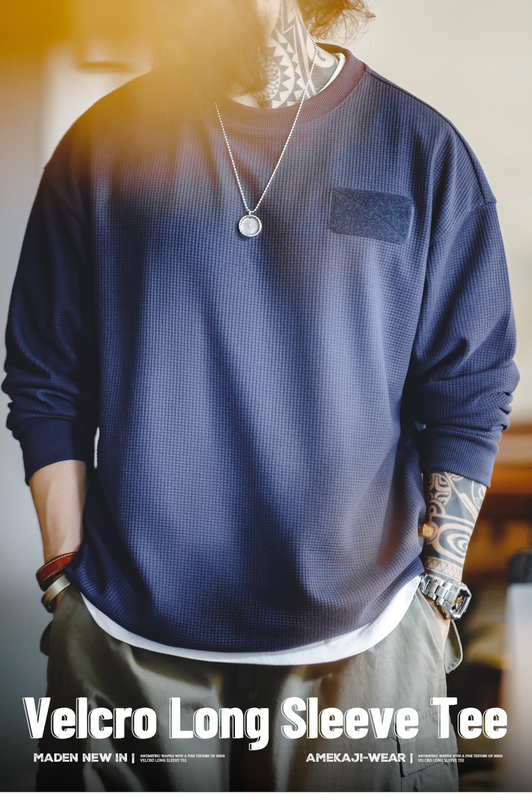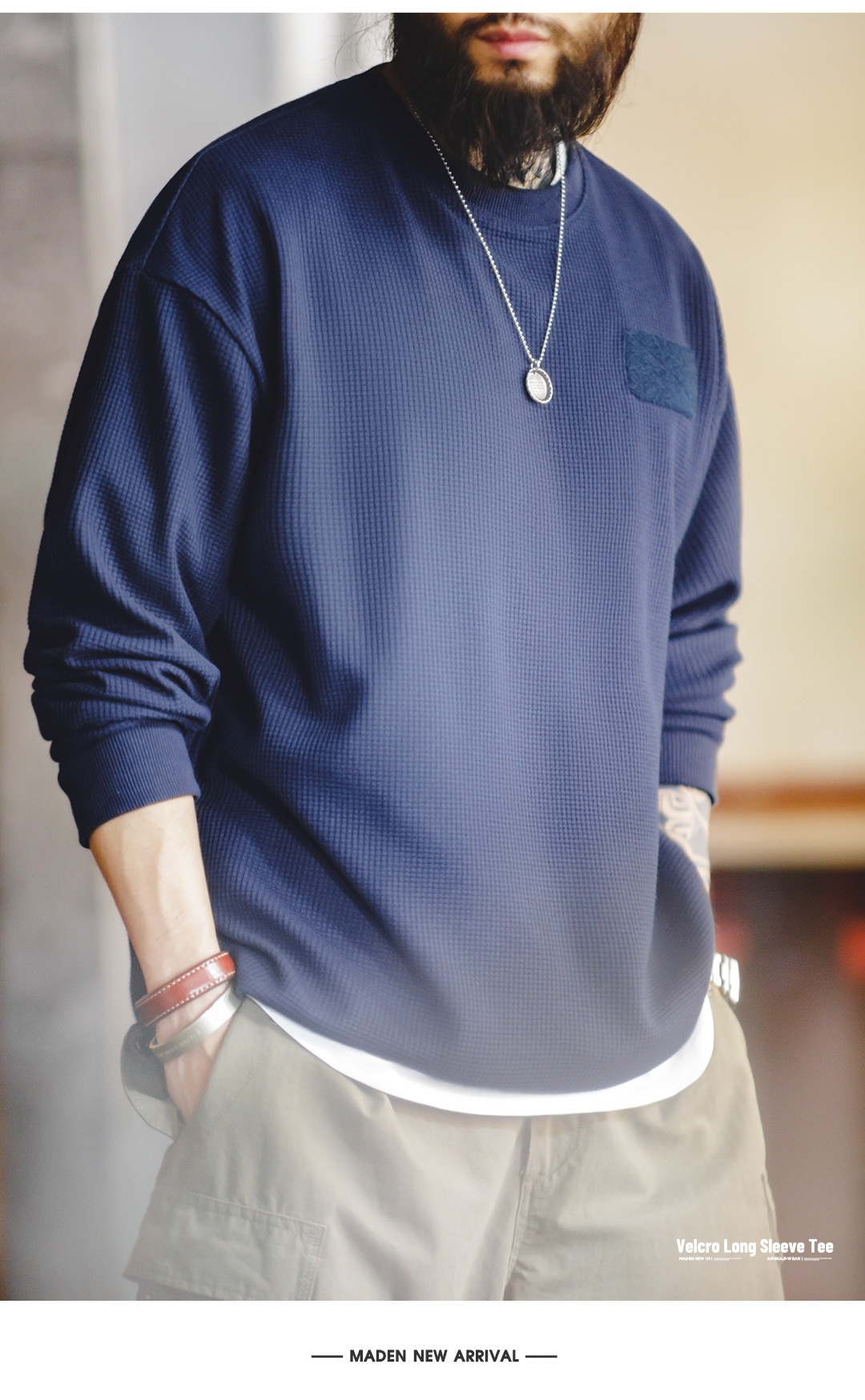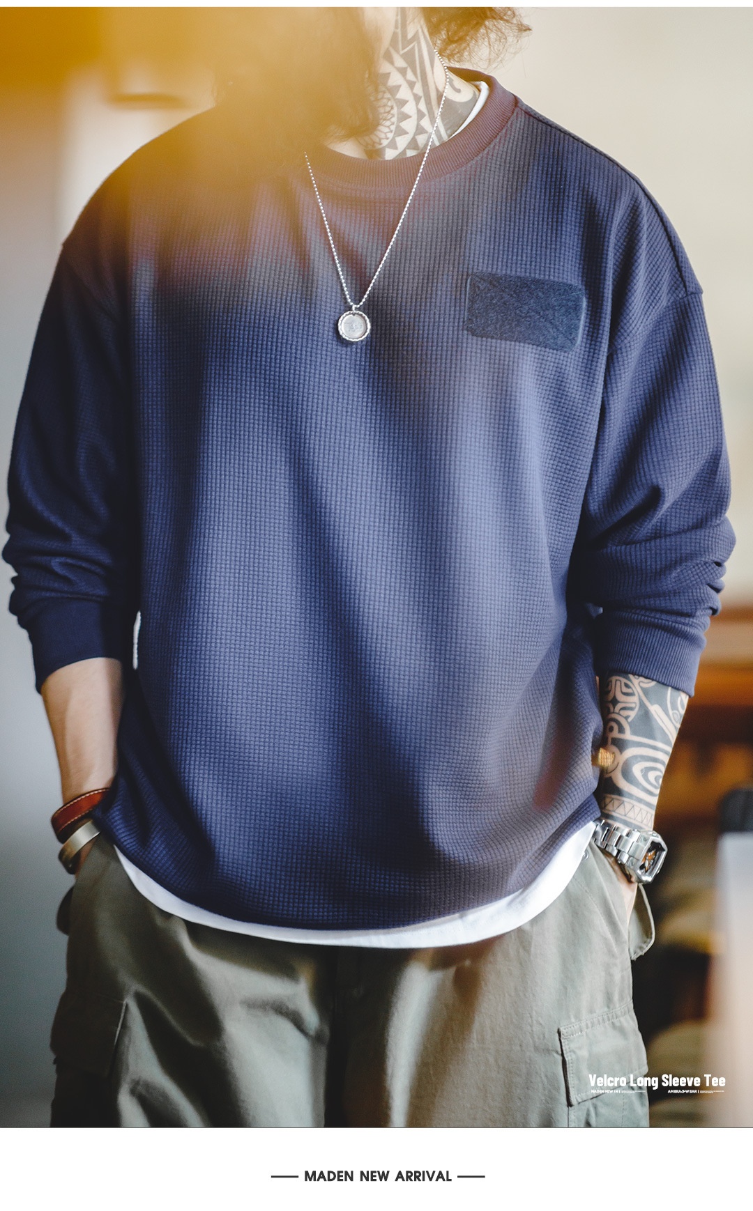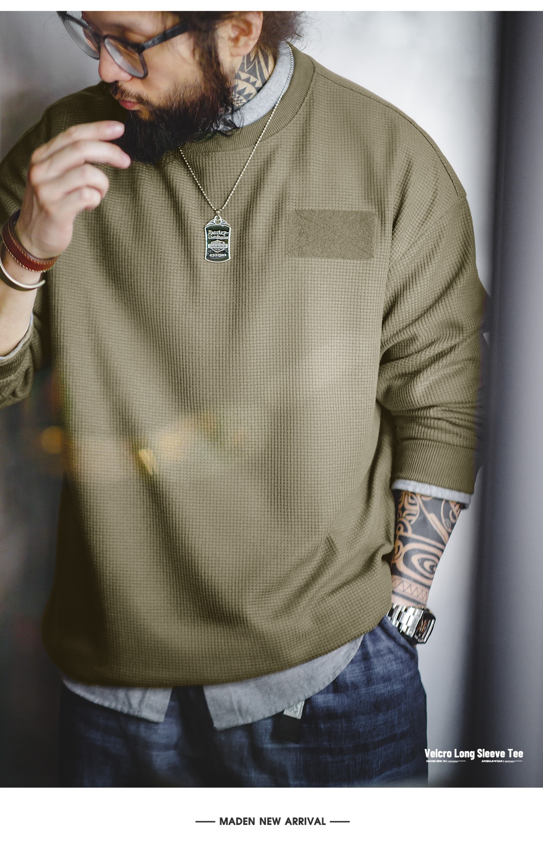 马登工装 美式休闲华夫格长袖T圆领魔术贴叠穿卫衣男秋