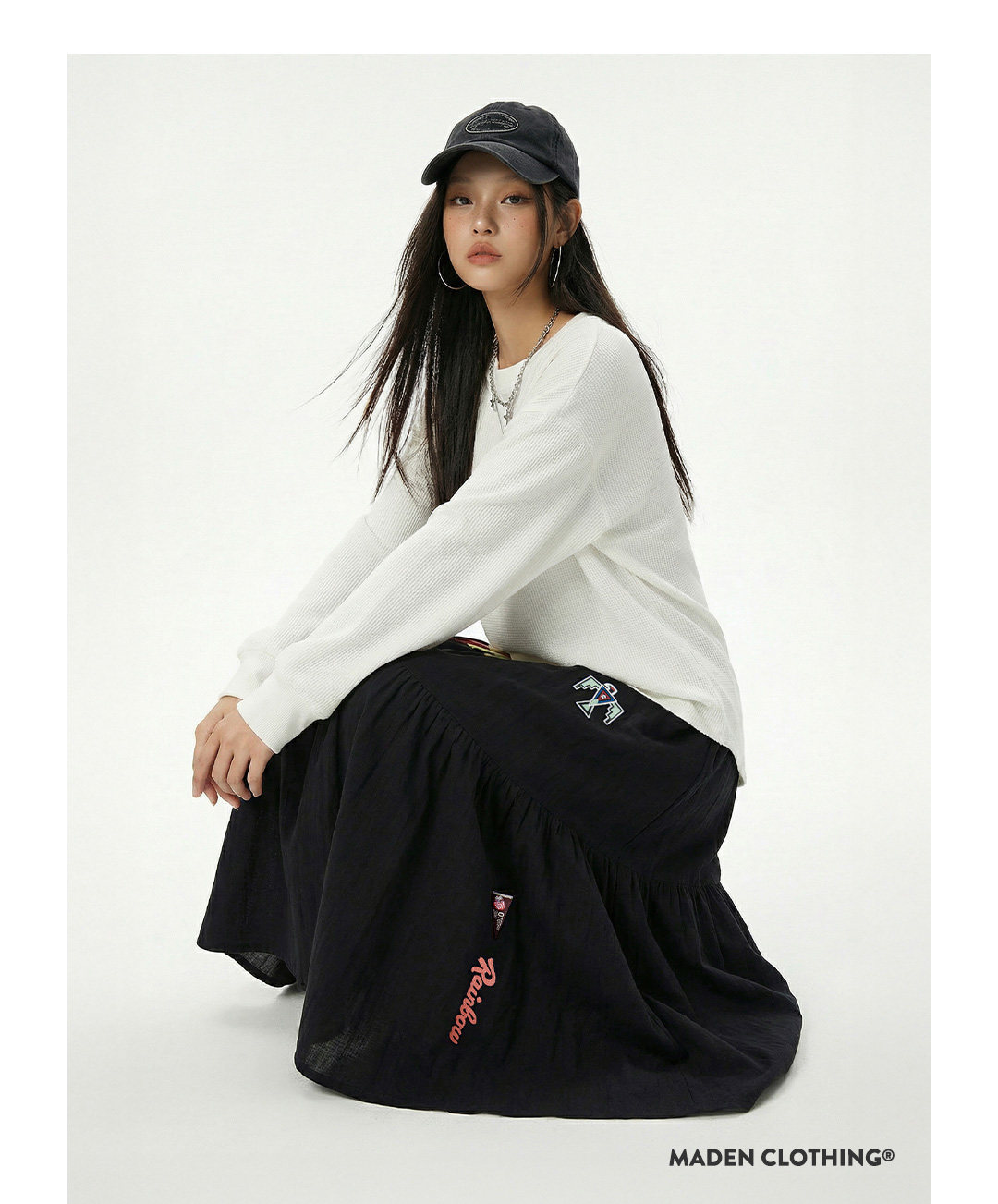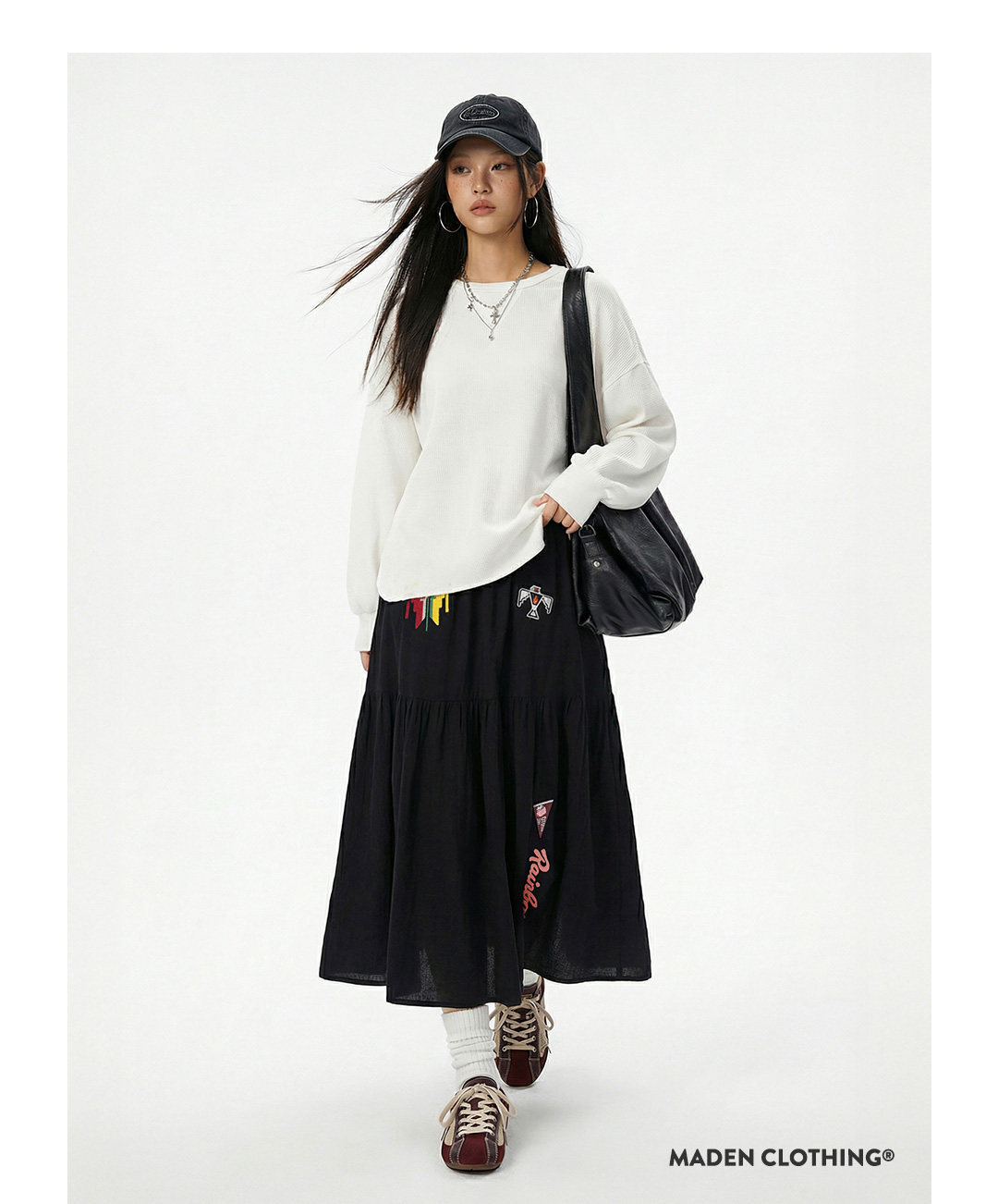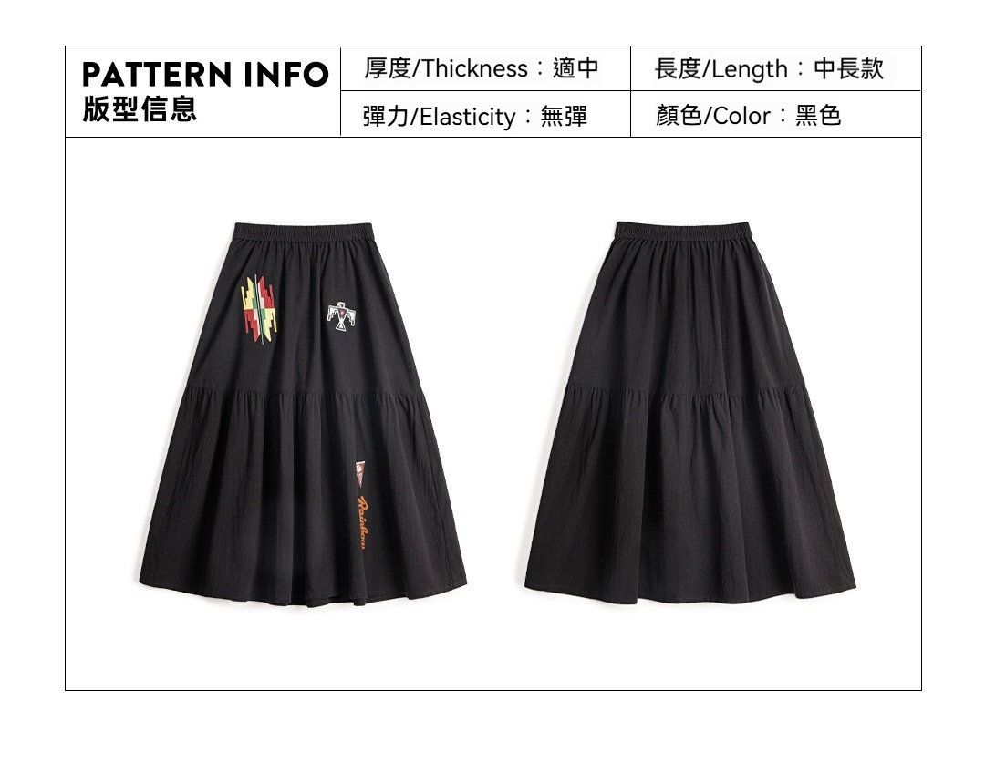 黑色復古鬆緊腰刺繡花A字過膝大裙擺半身長裙拼接裙子女士春