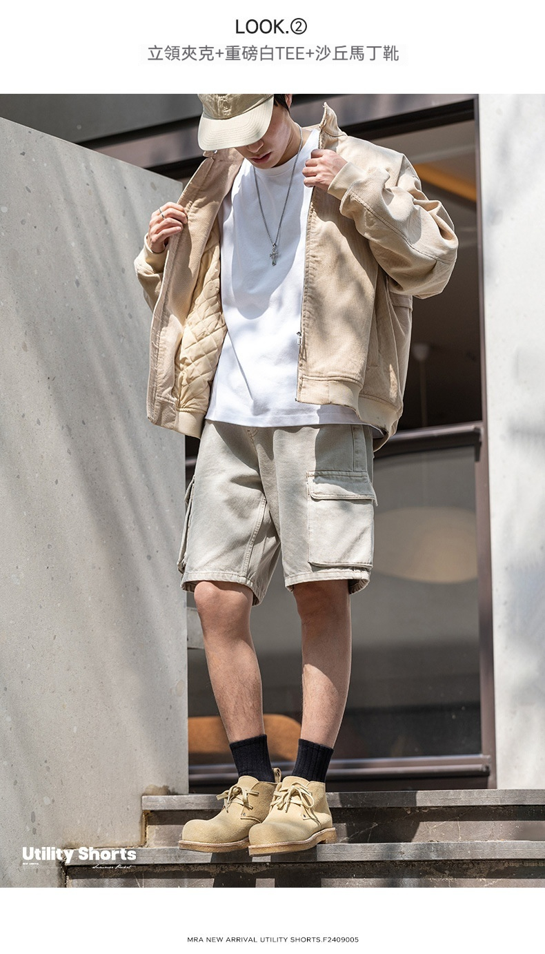 MRA多口袋工裝褲直筒短褲水洗做舊重磅寬鬆純棉五分褲男夏