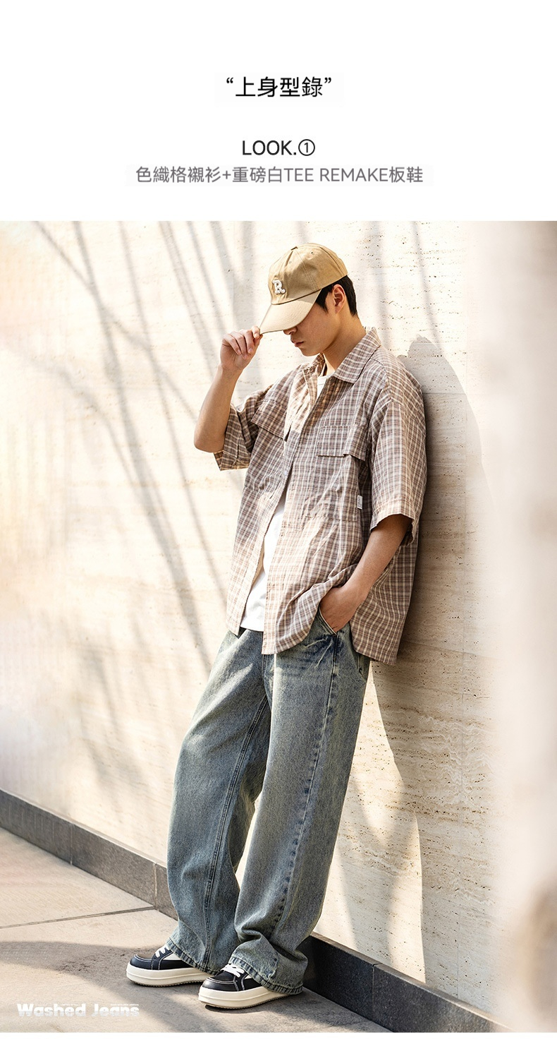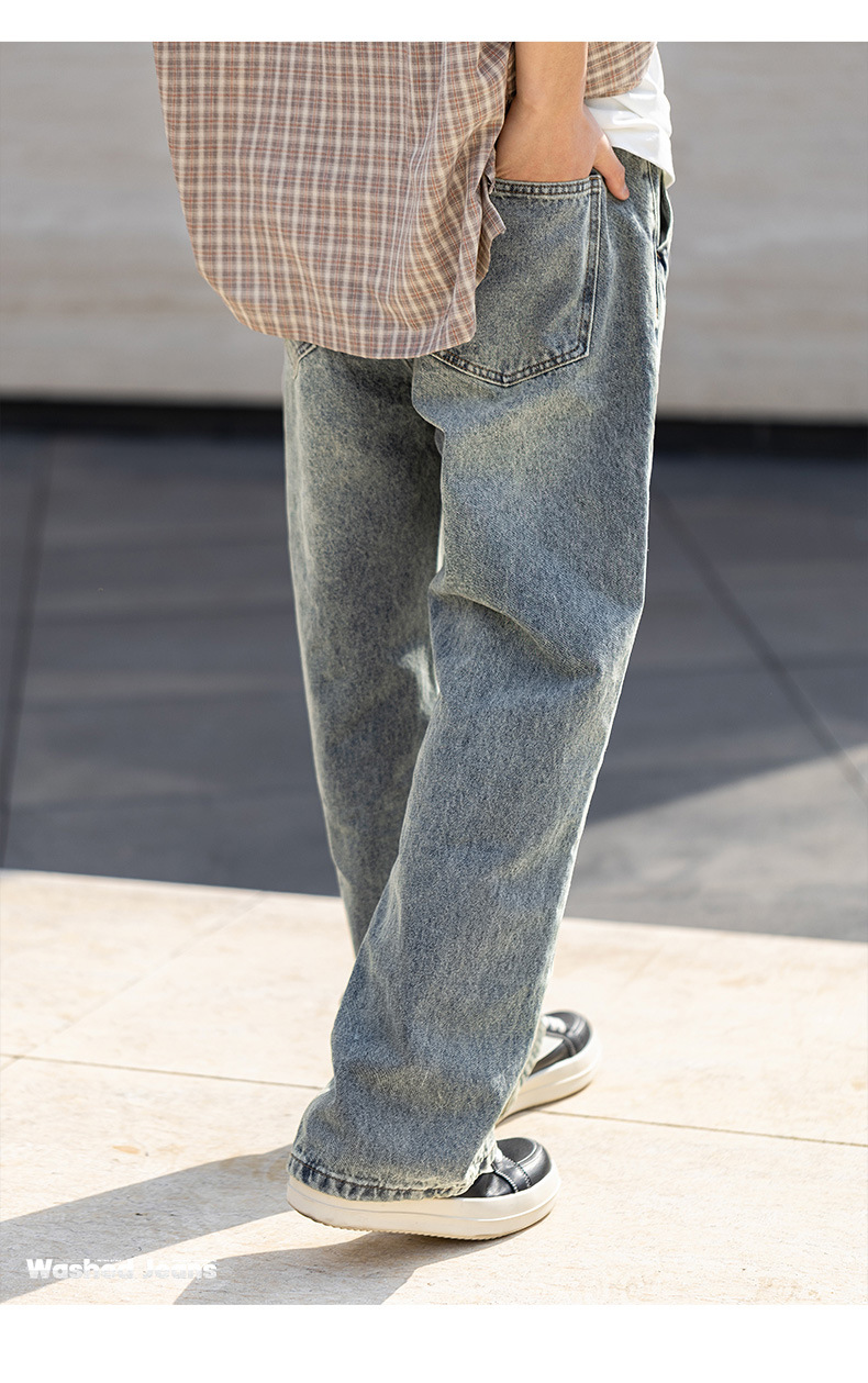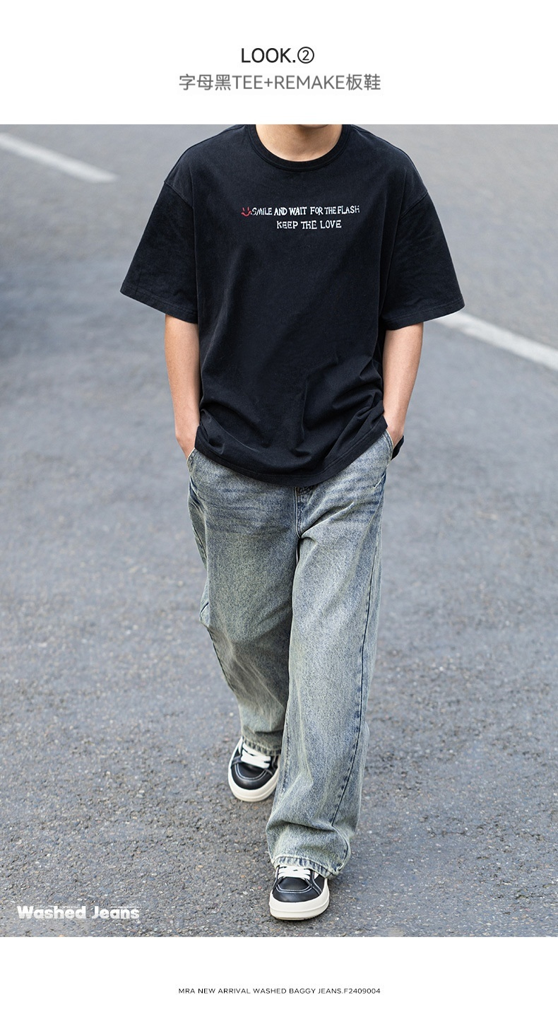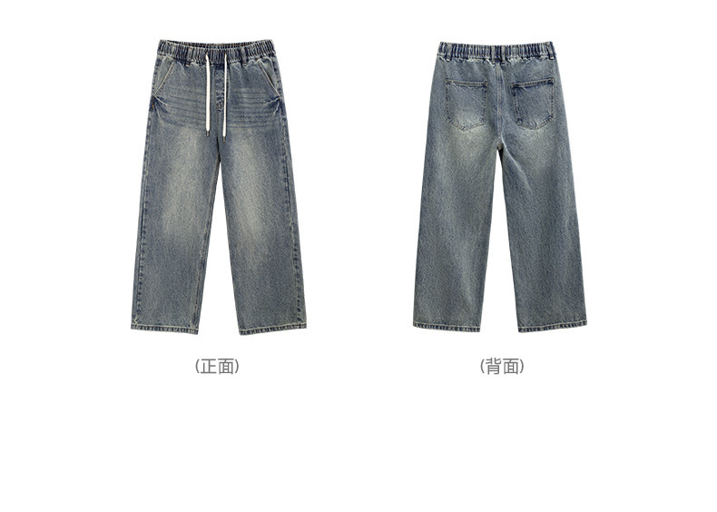 MRA鬆緊腰猫須水洗牛仔褲復古丹寧直筒寬鬆休閒長褲子男夏